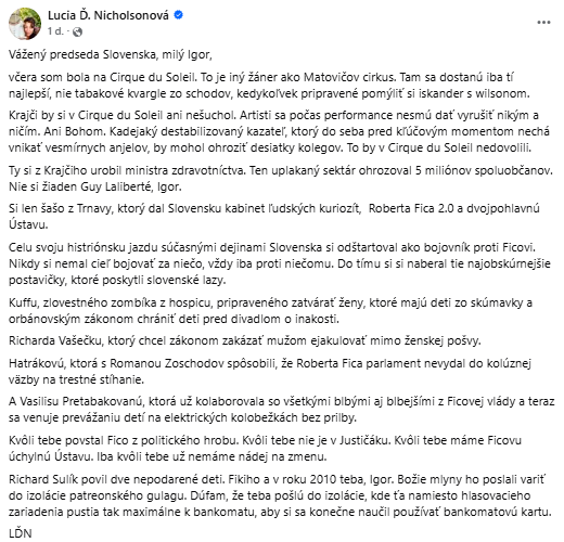 ◉ V statuse prirovnala jeho vládu k cirkusu a použila ostré metafory aj voči viacerým známym postavám.