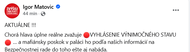 Opozičný politik Igor Matovič na sociálnych sieťach varoval, že vláda podľa jeho informácií zvažuje vyhlásenie výnimočného stavu. „Chorá hlava úplne reálne uvažuje o VYHLÁSENÍ VÝNIMOČNÉHO STAVU, pričom mafiánsky poskok v prezidentskom paláci ho k tomu ešte nabáda,“ napísal Matovič.